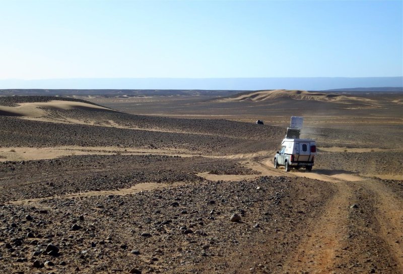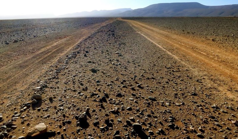 Offroad (bzw was man halt so nennt - kein Teer jedenfalls) en direct Richtung Merzouga / Erg Chebbi. Es wird wieder flacher und steiniger. Vor der Sandwüste kommt die Steinwüste.