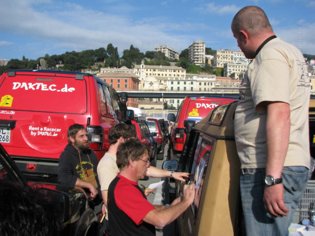 Im Hafen steht bereits der KAT und wir freuen uns, daß nur ein vom Wandler nicht in Ordnung war. Anscheinend hatte es sich aber angehört, als hätte es Zahnausfall im Getriebe gegeben. Zügig treffen alle Orgamitglieder ein und wir verladen unser Auto auf dem KAT. Gerhard - unser Doc, der vorher noch nicht viel mit 4x4 und der Wüste zu tun hatte - ist nur am Staunen. Unser Auto auf dem KAT, die Afrikaner, die mit satt beladenen Autos in den Hafen kommen, die Rallyeautos von uns und der El Chott - das sind für ihn alles neue Eindrücke.