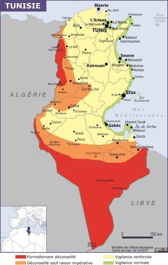Risikokarte Tunesien, ausgegeben vom französischen Außenministerium, aktualisiert am 4. Oktober 2013