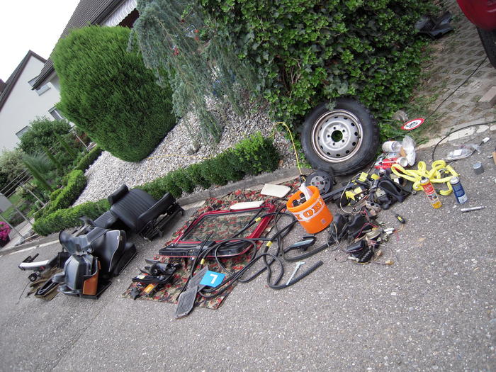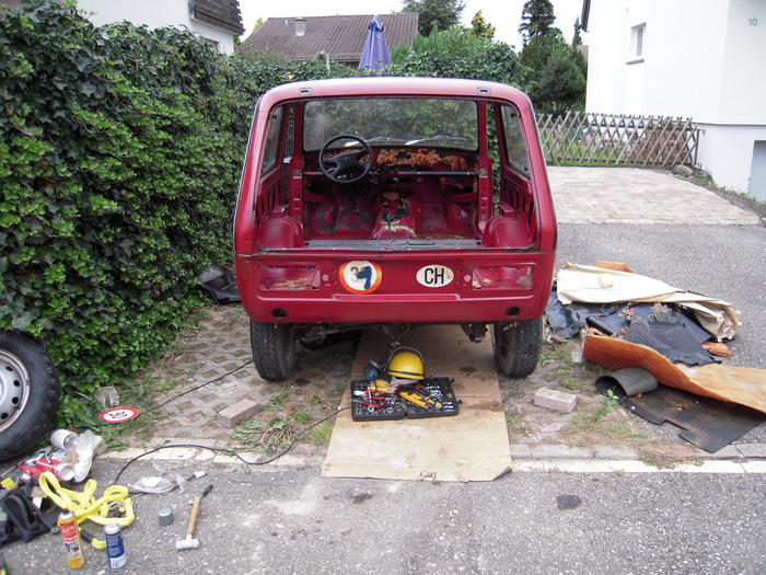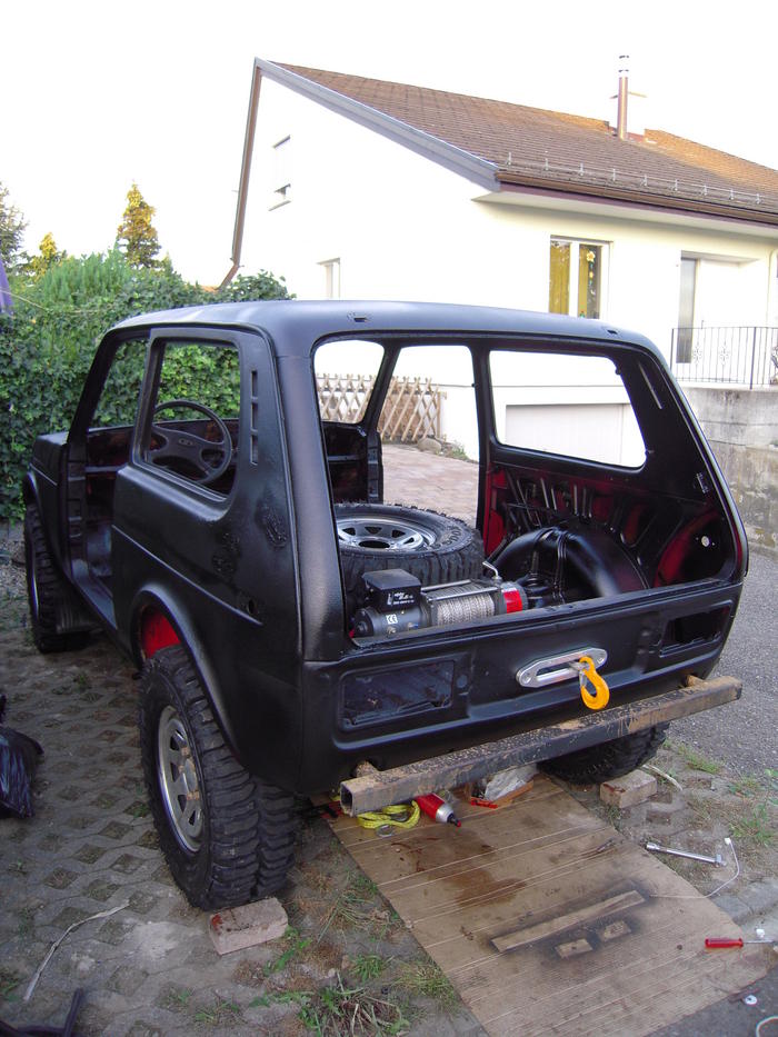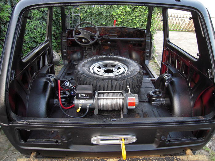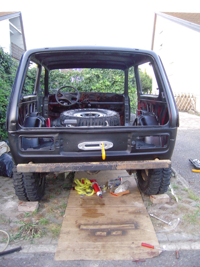 alles raus genommen, rostschutz oben rum gemacht, ebenso lackierung. unterboden und fahrwerksteile müssen noch. Seilwinde im heck eingebaut, seilfenster, stosstangen und multi-lenkrad drangeschraubt (das andere wär zu schade). heut werd ich mal mit der verkabelung anfangen und die radkästen ev. noch bearbeiten.