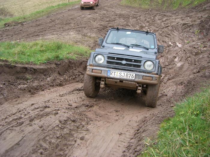 an dem tag war es so glitschig, da hat man in der senke unten null anlauf bekommen. die hummer sind mit karacho hochgekommen, aber die jimny und LR90 haben es nicht geschafft. mit ketten hingegen...ging es ohne vollgasorgie, fast schon entspannt. traktion auf der HA 95%, während vorne 45%.