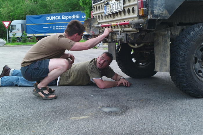 Freundlicherweise erklärte er sich bereit in München die rettende Wasserpumpe abzuholen und auf dem Rastplatz unser unfreiwilligen Wahl vorbei zu bringen. Unerwähnt ließ er dabei, dass er auf seinem Stop over in München noch ein Date in einem Biergarten hatte – ein Umstand der ihm eine entspannte Anreise und uns am Ende über 6 Stunden erholsame Rast auf einem Grünstreifen zwischen LKWs einbrachte. Und als wäre das noch nicht Lohn genug konnten wir dann auch den Einbau einer Wasserpumpe in der von Taschenlampen erhellten Nacht üben. Eine wertvolle Lektion in Sache Contenance und Entspannungsübung für den folgenden Wettbewerb. Und in technischer Hinsicht der Beweis der Fähigkeit zur Selbsthilfe – ein Umstand der beruhigt, gerade zu Beginn einer 1-wöchigen Tour durch die weitgehend werkstattlosen Karpaten.