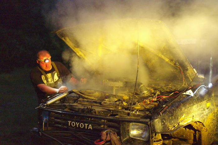 Übermotivation? Vielleicht – oder eine Warnung von fürsorglicher übergeordneter Stelle, wer weiß das schon. Eins war aber sicher, die Nachtetappe hatte ein jähes Ende gefunden. Die nächsten 3 Stunden waren mit Aufrichten, Reinigung von Luftfilter, Ansaugtrakt, Turbolader und Motor von eingeschossenem Öl gefüllt und nicht zuletzt mit dem Suchen und Erreichen einer ebenen Fläche zur nachhaltigen Reparatur des Toyota und für das Zelt.