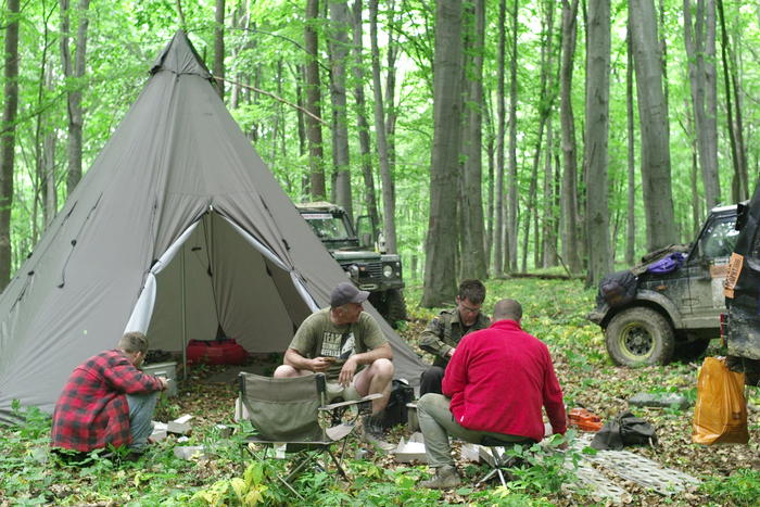 Wen wundert es also ob dieser Einleitung, dass im Kampf mit Material und geographischen Gegebenheiten der Uneinsichtige unterliegt. Und als Ergebnis nach 11 Stunden harter Auseinandersetzung ein O-förmiger Track auf den Bergrücken gezaubert ist. Und im Bemühen die Tagfahrzeit bis zum Erreichen eines Platzes zum Zeltaufstellen nicht zu überschreiten 2 Winden bis an die Belastungsgrenze und darüber belastet werden – mit dem auf den ersten Blick traurigem Ergebnis, dass im abendlichen Lager nicht nur die seelischen, sondern auch die automobilen Wunden geleckt werden mussten. Und als wäre das nicht genug auch die Taktik für den nächsten Tag völlig untypisch auf Ankommen im Ziel mit über 2 Stunden überschüssiger Fahrzeit umgestellt werden musste. Bei den Witterungsbedingungen wären 3 Autos mit nur einer funktionierenden einfach zu riskant gewesen um durch den Korridor seinen Weg zu suchen. Aber wir haben gefightet, hatten einen Riesenspaß an Landschaft und Herausforderung und haben uns letztendlich Hennings Trophy Maxime „to finish first you have to finish first“ einmal mehr beugen müssen. Also raus aus dem Korridor und ins Ziel – vielleicht noch an der einen oder anderen Stelle ein paar Kilometer in den Korridor rein um wenigstens in der Kilometerwertung vorne zu liegen. Mit diesen Gedanken und von Linseneintopf mit Würstchen a la deutsche Bundeswehr gestärkt legten wir uns in vertrauter Runde im Tipi zur Ruhe. Um in der Nacht ein noch heftigeres Gewitter über uns herziehend zu erleben – quasi das Gelächter der Natur über den untauglichen Versuch des letzen Tages die Karpaten nur mit eisernem Willen und Kraft zu bezwingen.