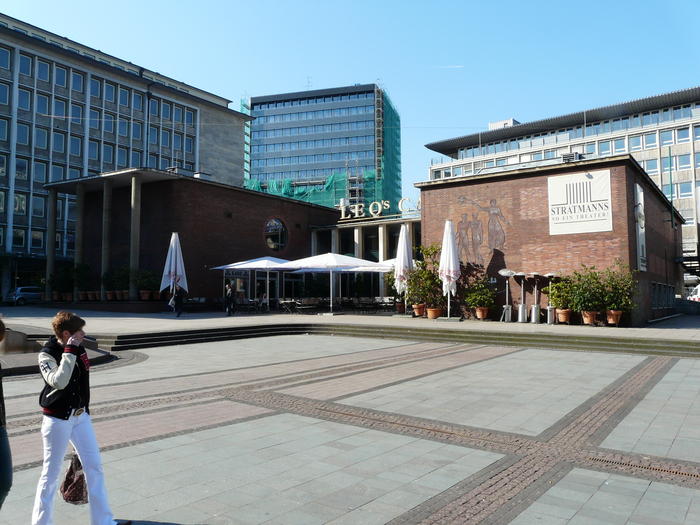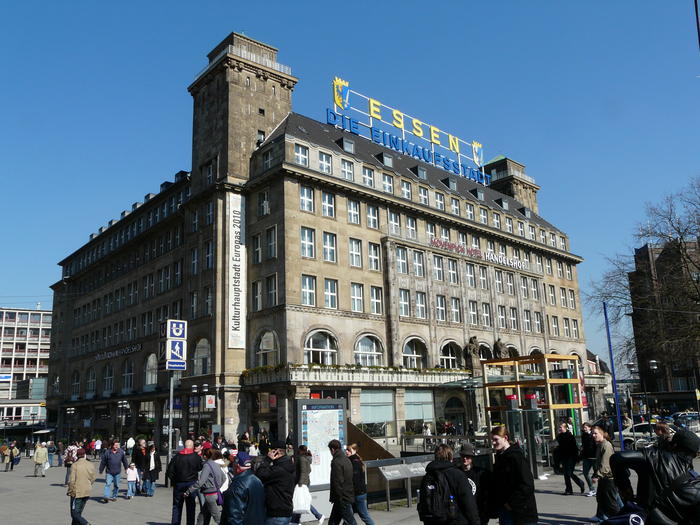 Der Handelshof, einst von Rühmanns Eltern betrieben. An der Stelle des Handelshofes befand sich im Mittelalter das Kettwiger Tor der Anfang des 19. Jahrhunderts abgerissenen Essener Stadtmauer. Zum Ende des 19. Jahrhunderts befand sich hier das Hotel Zum Adler mit Adlerkeller an der Bachstraße, die hier verlief. Das Handelshofgebäude wurde in den Jahren 1911 und 1912 von den Kölner Architekten Carl Moritz und Werner Stahl erbaut. Das Hotel wurde 1913 eröffnet. Zu diesem Zeitpunkt befanden sich in den ca. 350 Räumen des Gebäudes neben dem Hotel noch zwei Restaurants, ein Café, eine Konditorei, ein Kino sowie mehrere Läden und Büroräume. Es wurde zu Beginn von den Eltern des 1902 in Essen im Hotel Stemme, das sich in der Nähe an der Kettwiger Straße befand, geborenen Schauspielers Heinz Rühmann geführt. Von hier geht es auf die Kettwiger Strasse, eine der ersten Fussgängerzonen dieser Welt.