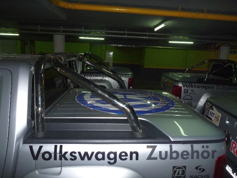 Der Amarok wird auf einem Offroad-Parcours gezeigt, probesitzen und den Motor angucken ist auch erlaubt. In der Hotel-Tiefgarage gab es außerdem den ersten Kontakt mit ?meinem? Auto für die nächsten Tage. Die Startnummer 909 steht auf BF Goodrich All Terrain. Die Befürchtung, das Gepäck auf der Ladefläche ordentlich einzusauen war umsonst, IKE-226 hat einen schicken Deckel über der Pritsche. Noch nicht auf dem Markt und schon Werkszubehör?