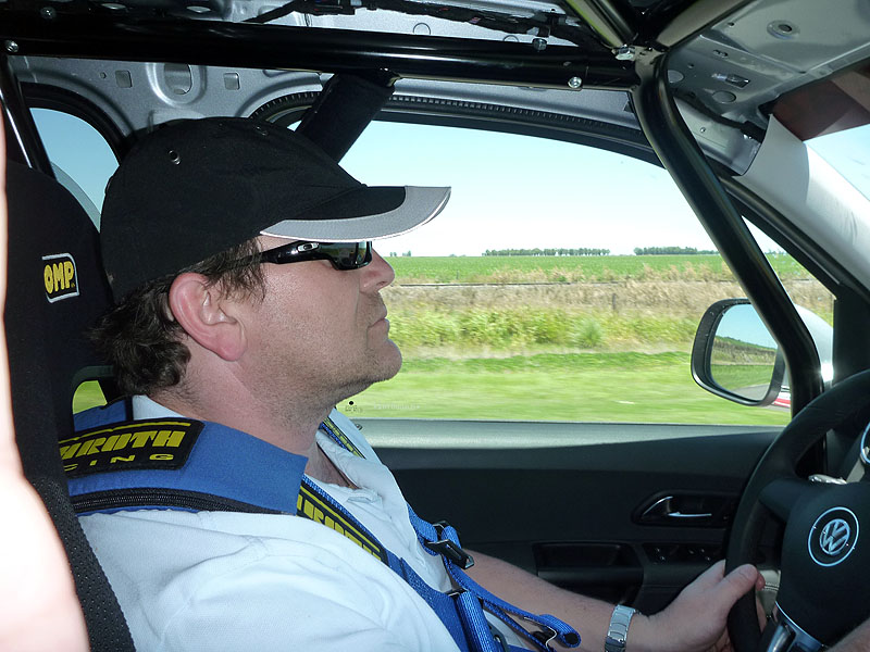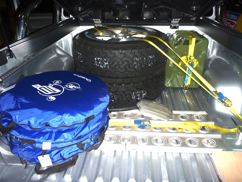 Die Vorgaben an die Begleitautos sind so streng wie bei den Rallyefahrzeugen im Wettbewerb. Unser Amarok ist deshalb mit Überrollkäfig, drei einzelnen Schalensitzen, zwei Notaus-Schaltern, zwei Ersatzrädern, Reservekanistern, Sandblechen und-schaufel, GPS und Notfall-Funksystem, Satelliten-Telefon, Feuerlöscher, ohne Dachimmel, aber dafür mit Radio. Wir müssen also nicht selbst singen.