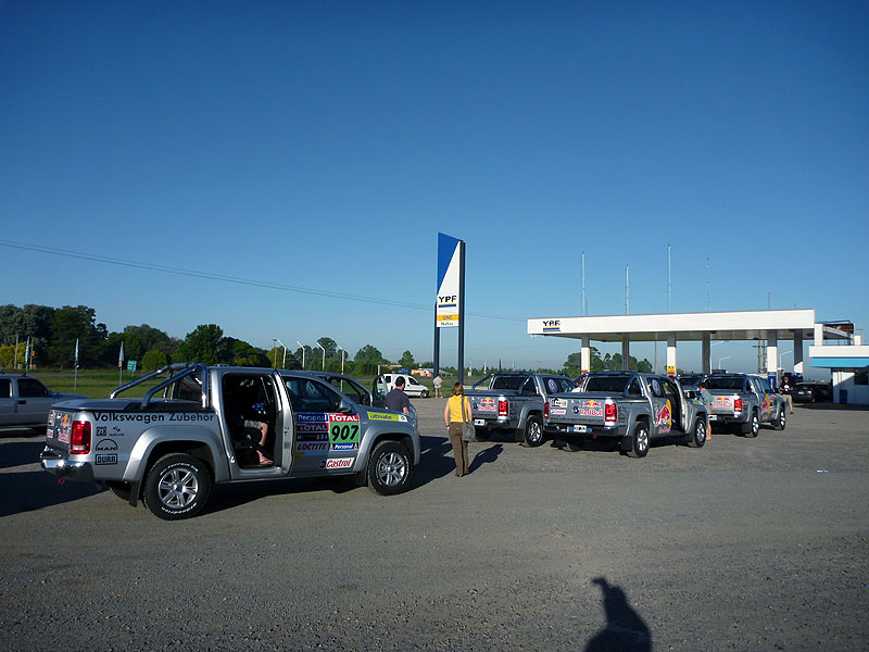 Der Zeitplan in Buenos Aires startet am 30.12. Das erste Meeting des kompletten Teams beginnt in den Abendstunden. Am Morgen des 31.12. gibt es dann das erste Zusammentreffen mit den Fahrzeugen. Wir müssen als Begleitteams ebenfalls durch die offizielle Abnahme des Rallye-Veranstalters. Die Amarok bekommen einen Technik-Check, die Unterlagen werden geprüft. Am Neujahrstag beginnt die Rallye mit dem Showstart über die Rampe. Richtig los geht es dann allerdings erst am 2. Januar. Um fünf Uhr früh starten wir mit den Amarok auf die erste, 800 Kilometer lange Etappe von Buenos Aires nach Cordoba.