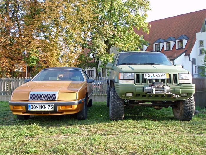 Neben dem 1,33m niedrigen LeBaron Cabrio wirkt der 1,90m hohe Offroad-GrandCherokee noch wuchtiger: