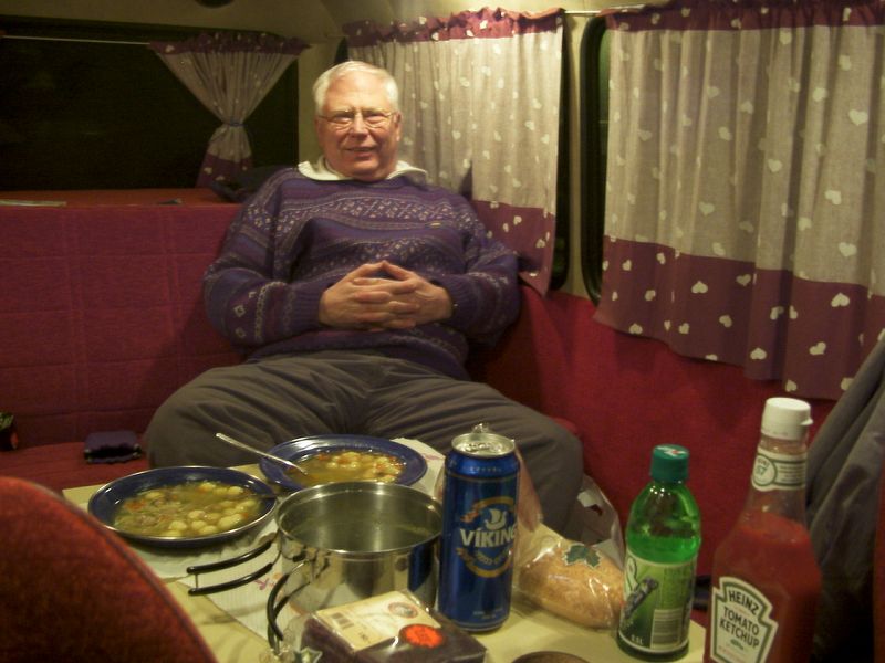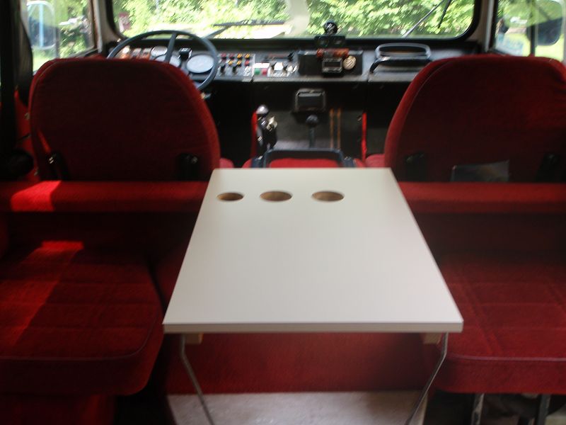 - Ausbau: freistehendes Einzelbett (für nur 1 Person!? Welcher Eremit hat das denn erfunden!?), ausklappbarer Tisch (während der Fahrt unter die „Hutablage“ geschoben – da steckt er das ganze Jahr über, braucht man fast nie…)