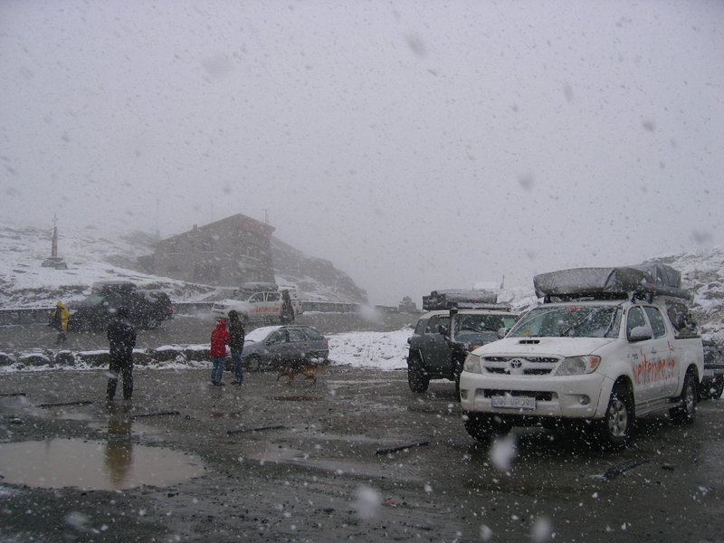 Participants of a fun rallye through Europe on the of the small St. Bernadino mountain pass.