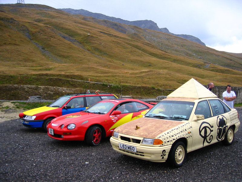 Teilnehmer einer Spass Rallye aus England auf dem Gipfel des kleinen St. Bernadino Passes.
