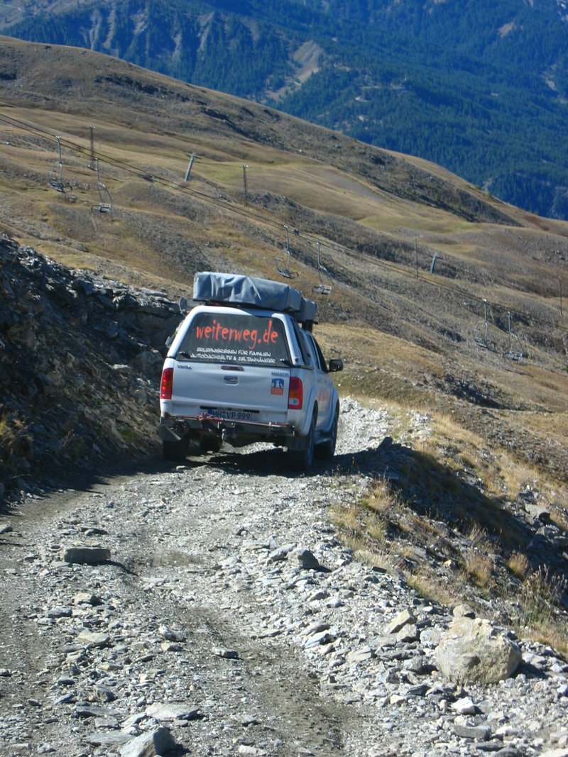 Die Skipiste direkt runter nach Bardonecchia lässt sich gut befahren, wenn auch einige Stellen steil und mit Geröll sind. Es ist ausdrücklich für 4x4 erlaubt!