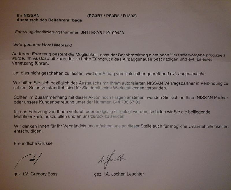 Verfasst am: 28.11.2013 12:37:13 Titel: Nissan Rückruf wegen Beifahrer Airbag Y61 |
