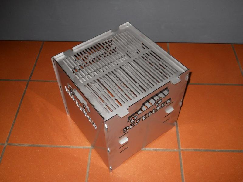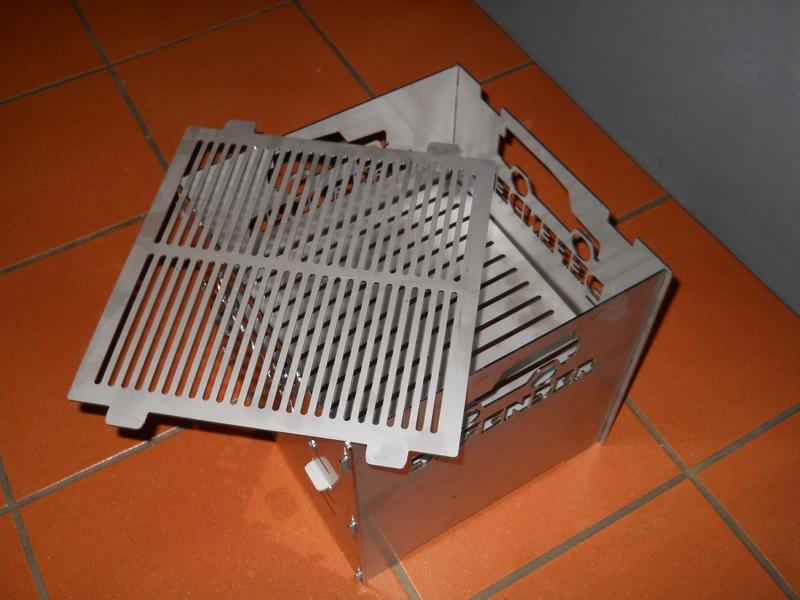 Herausgekommen ist der zerlegbare Grill mit einer Auflagefläche von 300x300mm, komplett aus 2mm Edelstahl gefertigt, der nach dem Zerlegen lediglich 300x300x12mm groß. Die Auflagen sind unterschiedlich "fein" gerippt, sodass man wahlweise die Grobe oder die Feine für Kohlen oder das Grillgut einsetzen kann, je nach Hektik, Grillgut oder gewünschtem Bräunungsgrad.