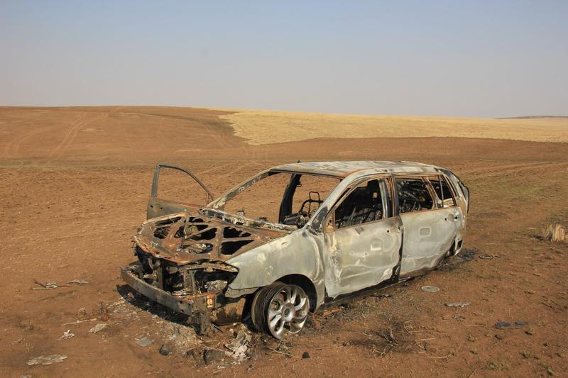 Auto abgebrannt, auch ich fuhr dann schnell raus als der wind zu drehen begann bei den Löscharbeiten. Hier brannte zuerst das Auto (schon Tage vorher), dann begann die Steppe zu brennen.