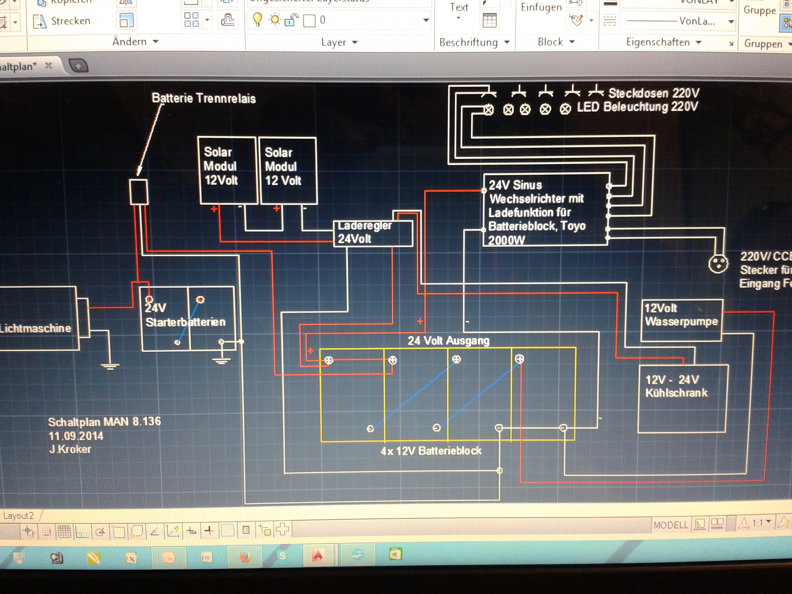 Den einbau einer 2. Lichtmaschine will ich nicht und ich moechte am 24V system festhalten. Da meine Wasserpumpe aber 12 Volt hat weiss ich nicht ob es sinn macht diese an einer der 4 12V Batterien anzuschliessen oder aber lieber mit einem DC-DC 24V/12V Wandler zu arbeiten. Ich habe mal meinen geänderten Schaltplan angehängt, was denkt ihr geht das so oder ist das totaler blödsinn?