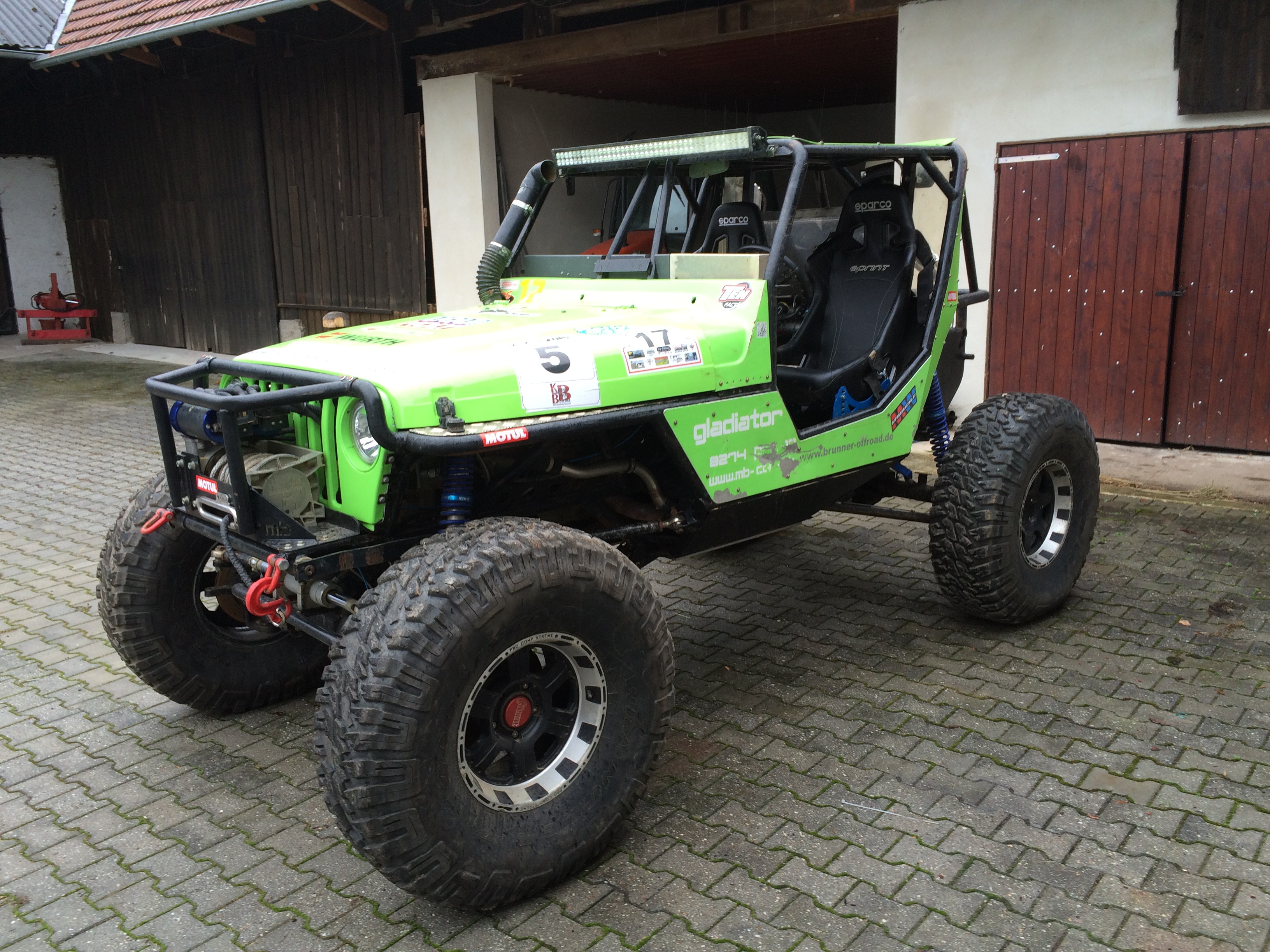 Ausstattung: Neue Sparco Vollschalensitze, 4 Punkt Gurt, Kühler und Lüfter hinten(ca. 18l Wasser) Kunstofftank 60l, 2ter Satz Reifen 40.13,5-17 Good Year únd 2 Nagel Neue incl Felgen dabei, Erdanker, 2 Optima Batterien, 105cm LED Lichtbalken, Ansaug nach oben verlegt.. usw usw