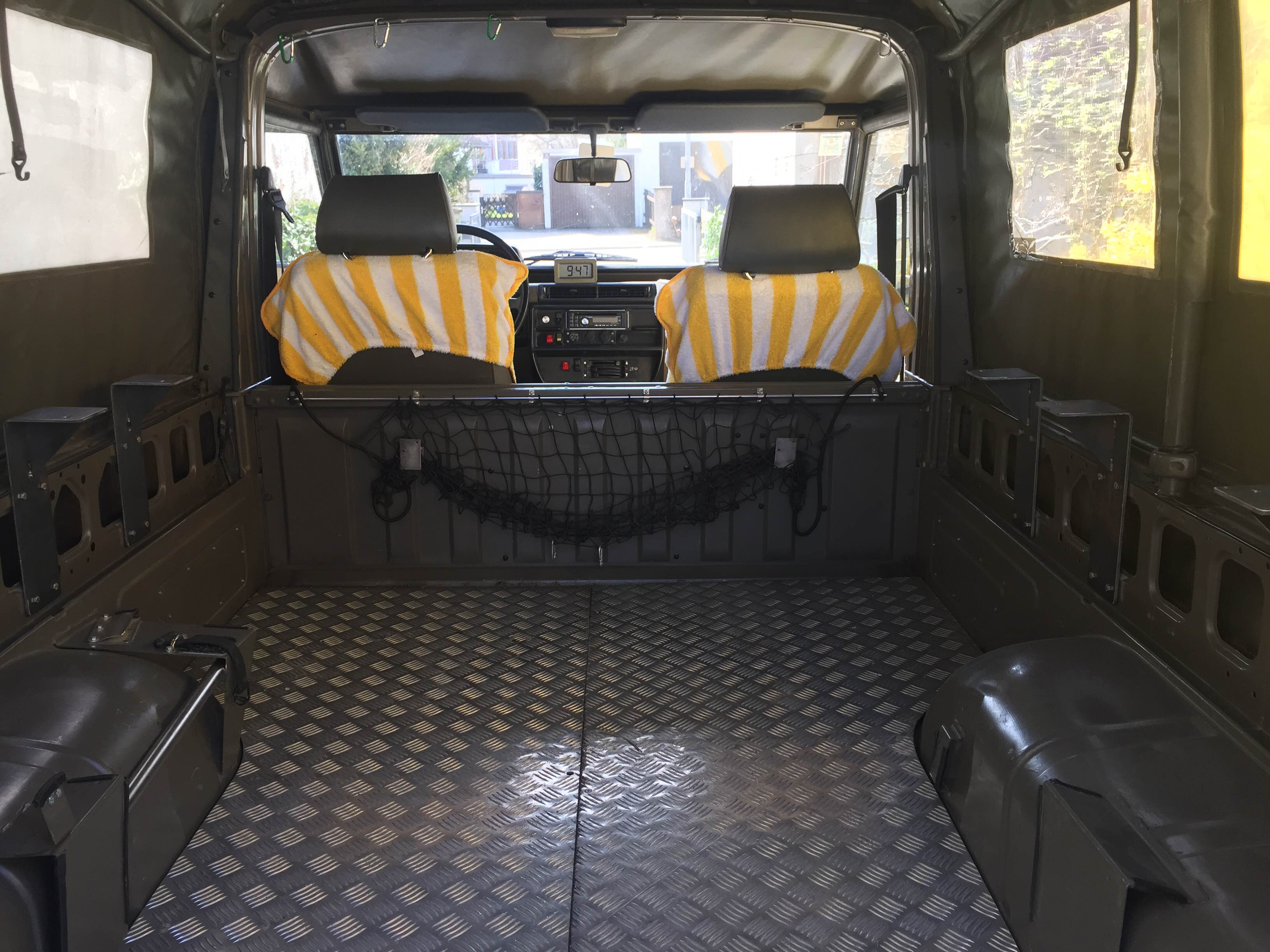 Ich habe mich auch an einen Innenausbau für meinen kurzen G entschieden, hierbei soll man darauf nicht schlafen können sondern nur als Ablagefläche dienen. Der ausbau ist aus Eichenbrettern gemacht, schwer aber gut. unten ist ein 2. boden eingezogen welcher unter sich den campingtisch beherbergt, dieser ist somit entnehmbar ohne die boxen zu bewegen. Bessere Bilder kann ich machen wenn es jemanden interessiert :)