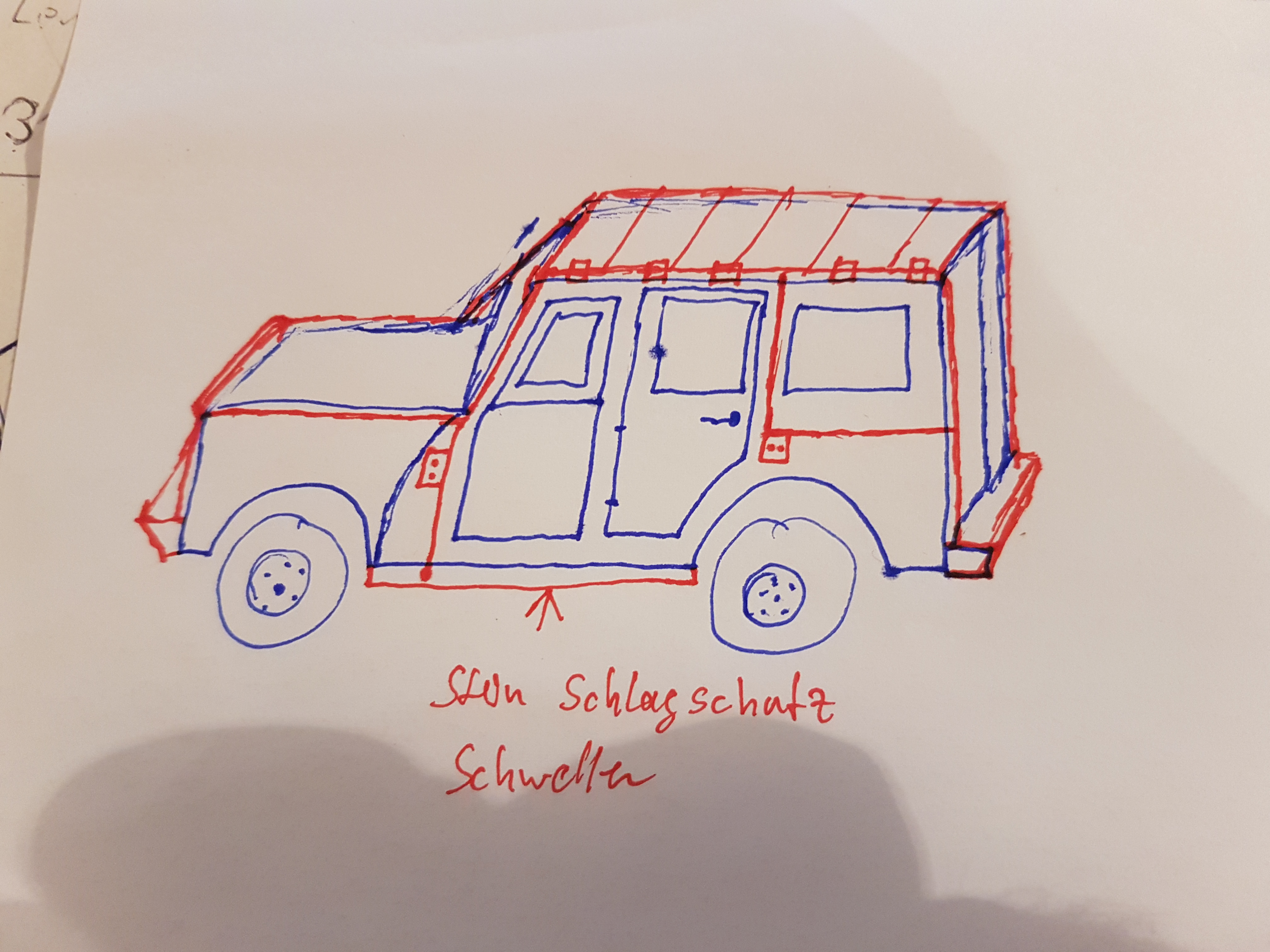 | Seilwindenstoßstange aus Aluminium- Hmm. Finde ich sportlich. Außenkäfig beim langen Radstand auch. Du müsstest ja an der dünnen B- Säule wenigstens einmal nach unten abstützen und dann hast Du ganz schnell Probleme mit dem Öffnen der Türen- besonders wenn Du hinten 90° Scharniere einbaust.
