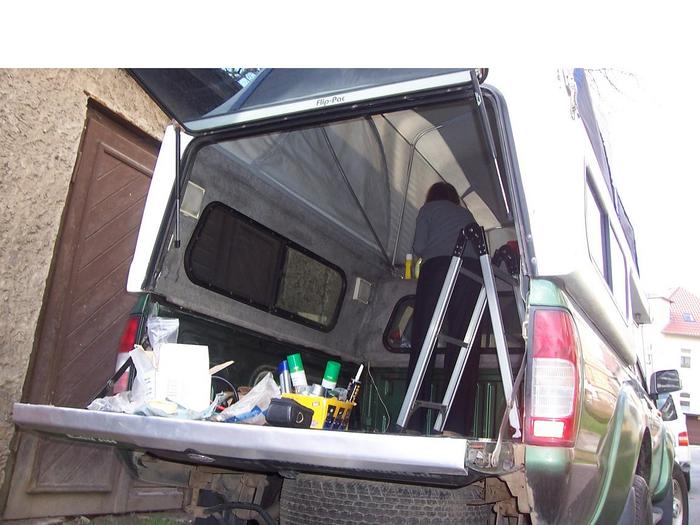 Eine Innenauskleidung für die Ladefläche komplett ist schon fertig. Matratze rein und restlicher Ausbau folgt (aus Zeitgründen wohl leider noch nicht bis zur Messe)