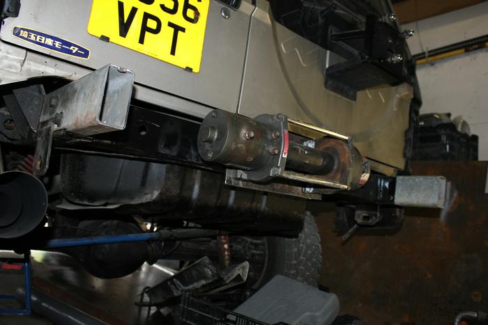 Stossstangen-Mittelstück eingepasst und mal Windenfenster drangehalten. Die ganze Sache steht nun schon etwas weit nach hinten raus. Optisch stört das noch nicht weil noch das Reserverad fehlt. Jedoch Geländetechnisch müsste ich so einbüssen.