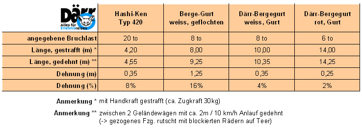 Mit dem Daerr-"Elastikgurt" hatte ich gerade auch wieder ein Erlebnis: im 1. Gang Untersetzung mit nicht getretener Kupplung im Standgas in den Gurt gefahren (am anderen Ende ein 4000kg WoMo) - und zack hat sich meine frisch angebaute ersteinmal gesetzt durch den Ruck... Und das bei angeblich 25 Prozent Dehnung