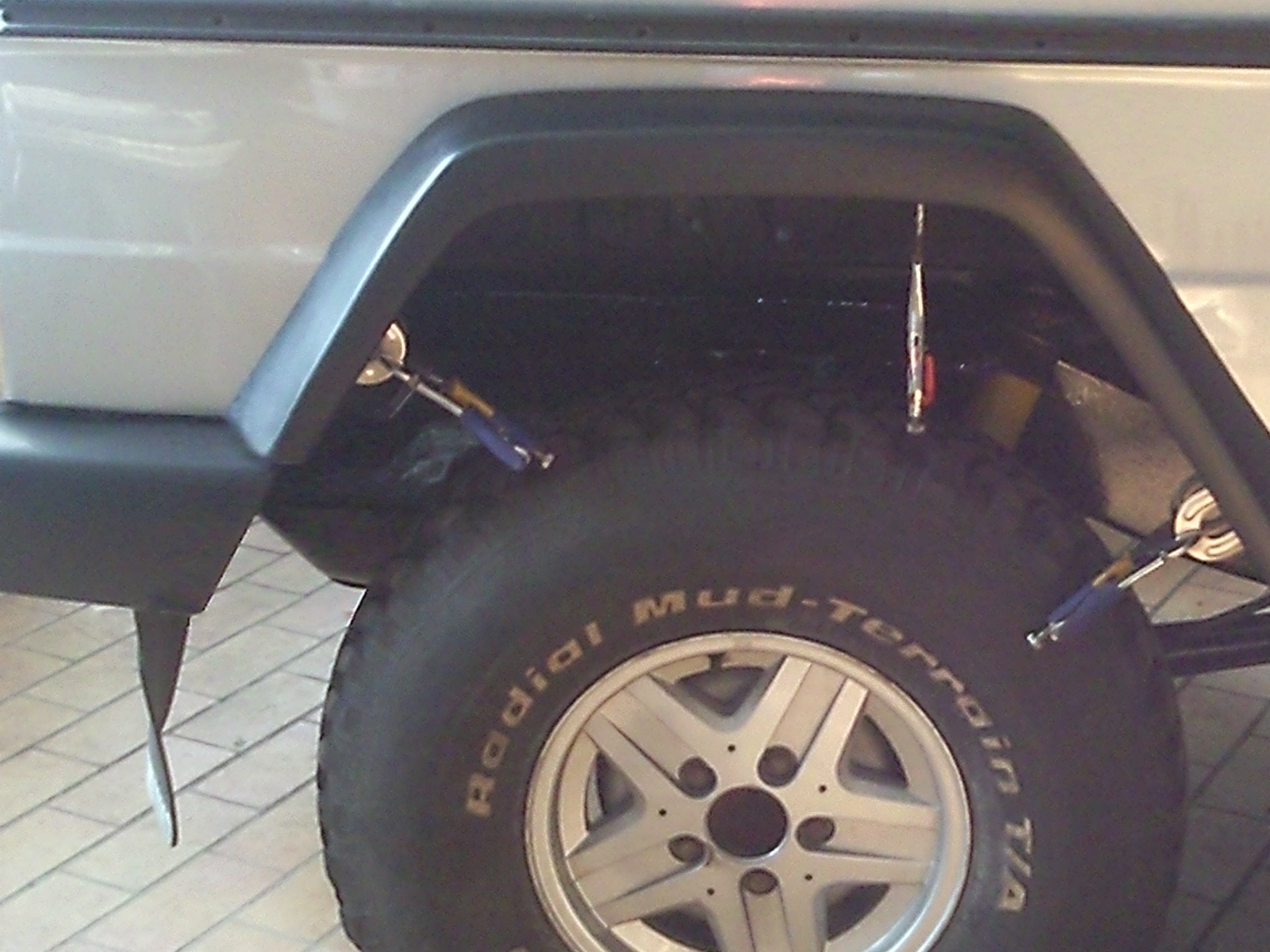 hier mal ne Ansicht meiner "polnischen" GFK Verbreiterungen hinten... Die werden halt ganz normal aufs Blech geschraubt und shcliessen innen passend mit dem Blech ab. Man kann also die Verbreiterung ranhalten, die Schnittkante am Blech anzeichnen, Verbreiterung weg und ausschneiden. wie man vielleicht erkennt, habe ich mich um die Blecharbeiten gedrueckt...