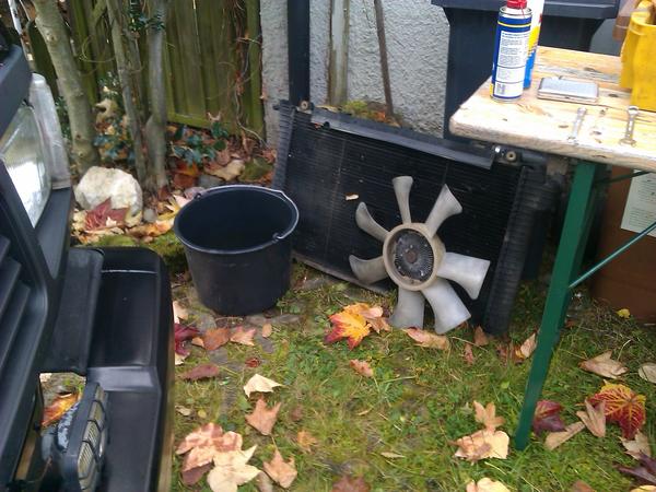 Erst mal Kühlwasser ablassen. Dazu den Schlauch unten links am Kühler ab. Nicht vergessen einen Eimer oder Wanne unter zu stellen. Dann die restlichen Kühlerschläuche weg machen. Am Kühler die unteren Luftleitbleche und die oberen 2 Halteschrauben entfernen.