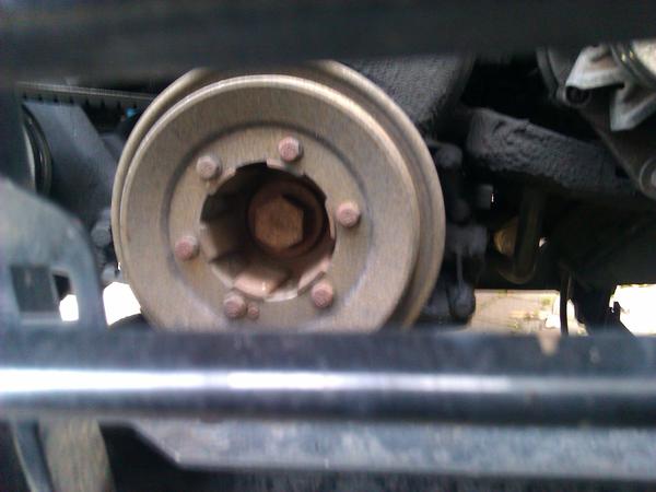 Dann die Hauptriemenscheibe an der Kurbelwelle lösen. Die Schraube hat einen 27er Kopf und geht ganz normal nach links auf. Ich wollte ganz schlau sein und hab es mit einem Schlagschraube versucht aber, vergiss es, das wird nix. Einfach Ratsche und Verlängerung, den 5. Gang einlegen Handbremse und Keil unters Rad und schon ist die Schraube auf. Riemenscheibe mit Abzieher vorsichtige abziehen. Leichte schläge mit Hammer und einem weichen Holz können hier bei vergammelten Teilen etwas helfen.