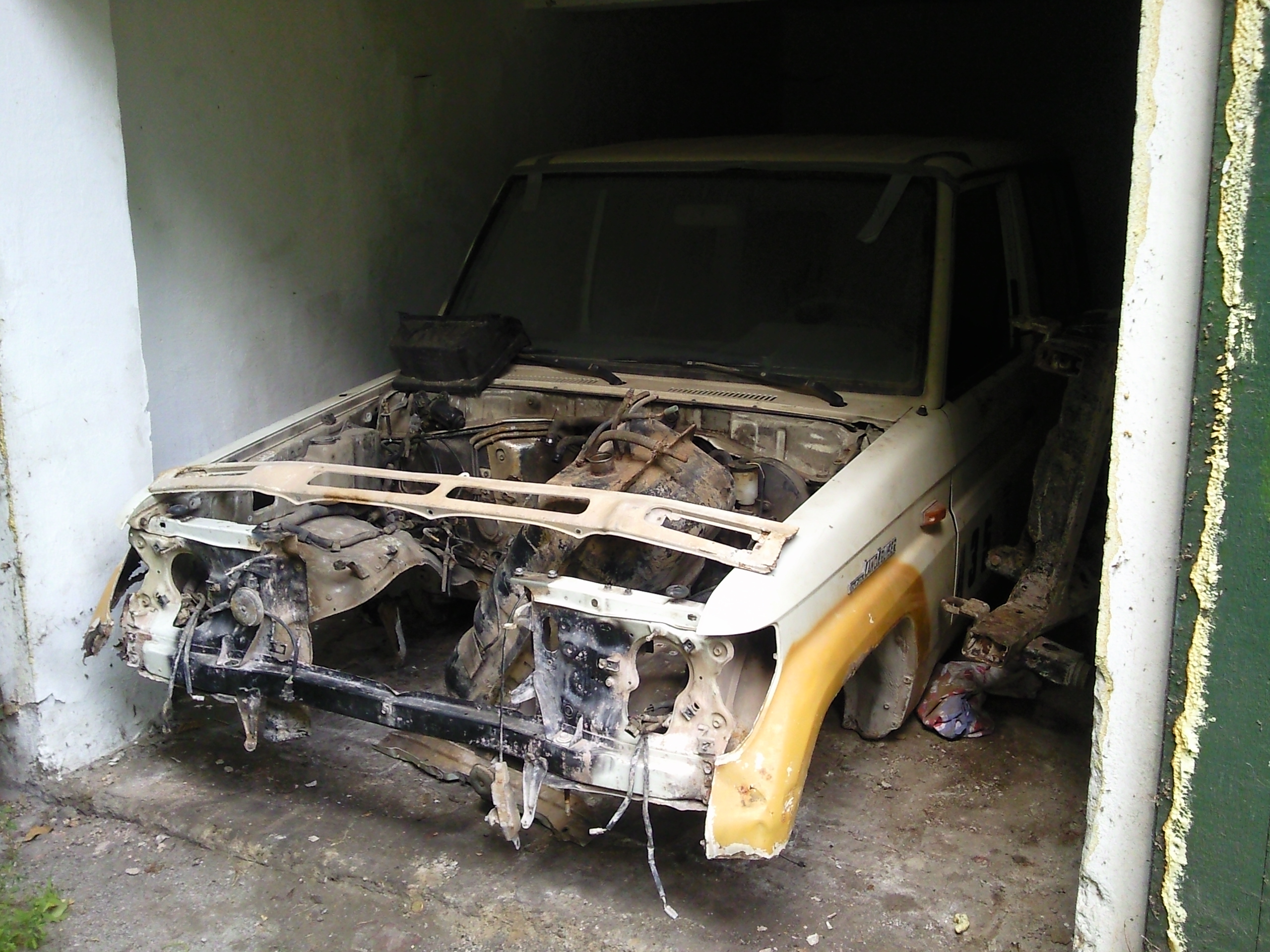 Biete einen Rahmen + Karosserie von einem Toyota LJ70 (eckige Scheinwerfer) an. Karosserie ist völlig ausgeräumt. Ohne Kotflügel,Fenster, Türen und Amaturenbrett und sehr stark durchgerostet. Der Rahmen müßte nur mal gestrahlt werden.