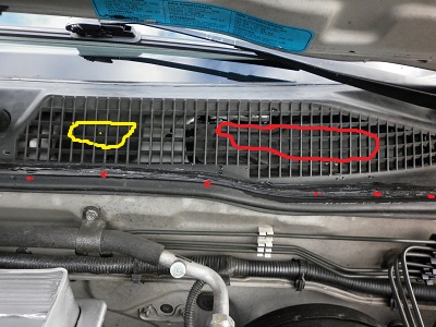 mit Karosseriedicht festgeklebt habe. Das gelb markierter Feld sind zwei Öffnungen für die Frischluft der Heizung,