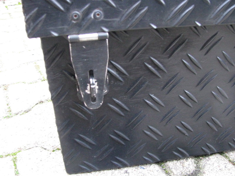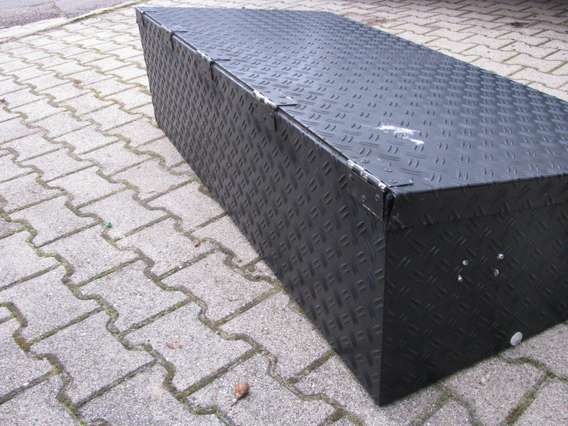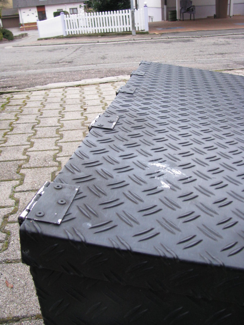 Die großen Kisten sind aus Alu-Riffelblech und schwarz pulverbeschichtet (oder wirklich gut lackiert, ich denke aber beschichtet).