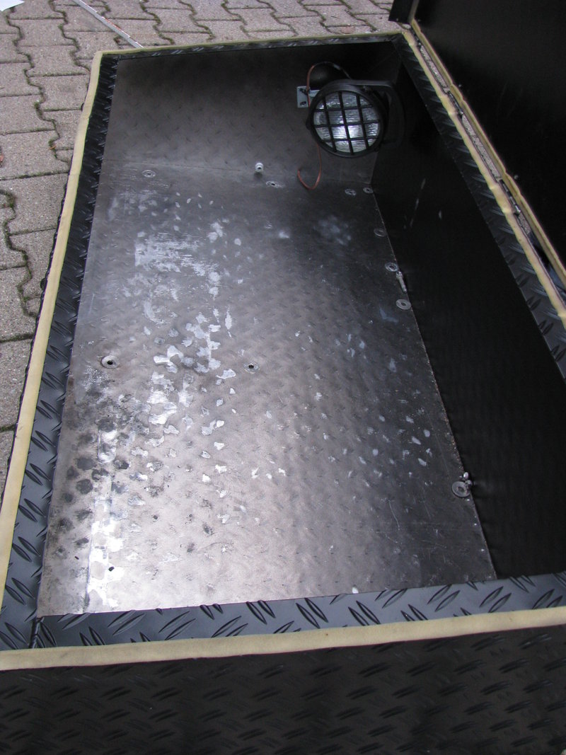 Innen ist zur Beleuchtung ein Arbeitsscheinwerfer angebracht und am unteren teil der Box die entsprechende Kabeldurchführung.