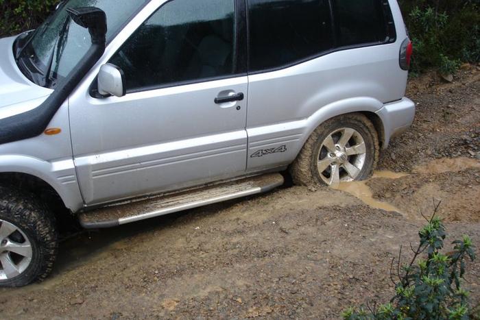 Ich kam diese matschige Steigung nicht hoch und wollte unten wenden. Dabei habe ich dann die Hinterräder versenkt; das eine, wie zu sehen, in einem Matschloch und das andere hing in der Luft über einem kleinen Bach. Das ist dann die Situation, wo eine Sperre hilfreich ist.