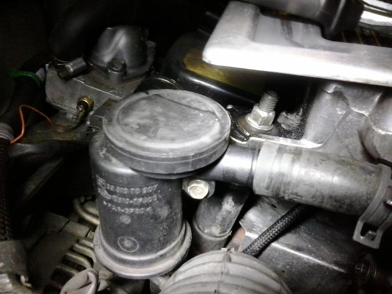 Stimmt, der Ölabscheider hat drei Anschlüsse. Einer geht runter zur Ölwanne, einer nimmt den Schlauch der Entlüftung vom Ventildeckel auf und einer stellt wohl die Verbindung zur Kurbelgehäuseentlüftung her.