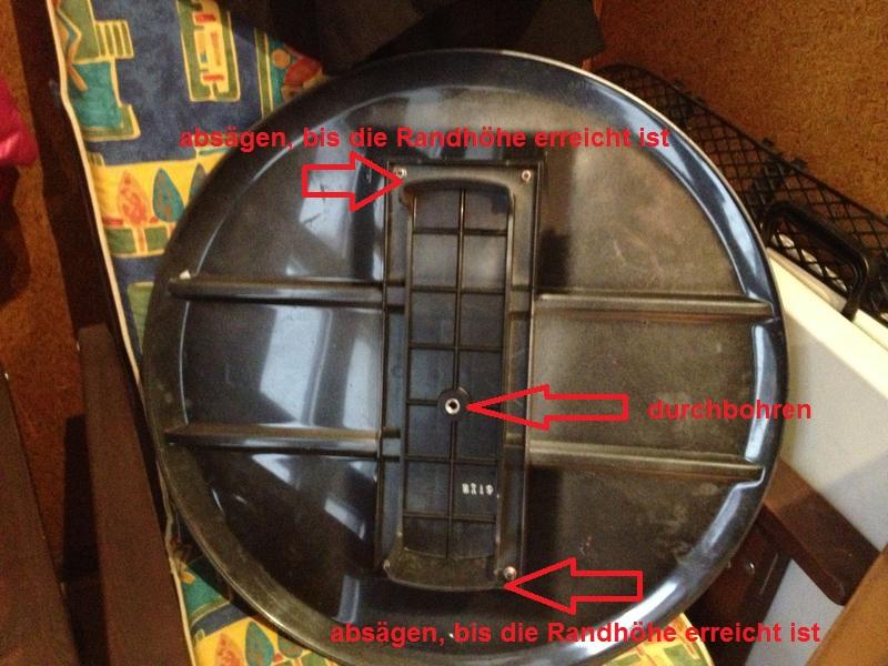 Die beiden Stege auf der Rückseite passen auch bei mir nicht durch die Felge, die habe ich so tief wie möglich abgesägt, so dass die Platte flach auf dem Reifen aufliegen kann. Dann wird in den Ersatzradträger ein Loch in entsprechender Grösse der Gewindestange gebohrt (ich habe ein Stück M10 genommen). Ich habe dazu einfach einen Stift in das Gewinde gesteckt und die Platte dann angehalten, so dass ich die Markierung zum bohren am Träger hatte.