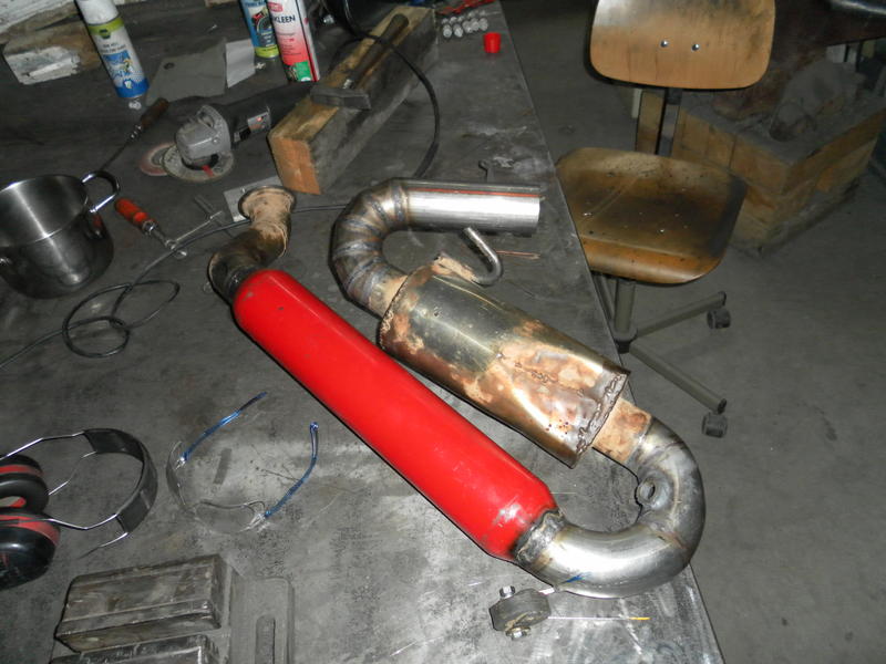 Gemacht habe ich da nicht viel - die Anlage war die Serienanlage, nur deutlich verkürzt und nur mit einem Dämpfer, der unter dem Beifahrersitz lag bzw. hing. Das Endrohr ging kurz vor dem rechten Hinterrad raus und war in etwa 30(?)° nach unten gedreht.