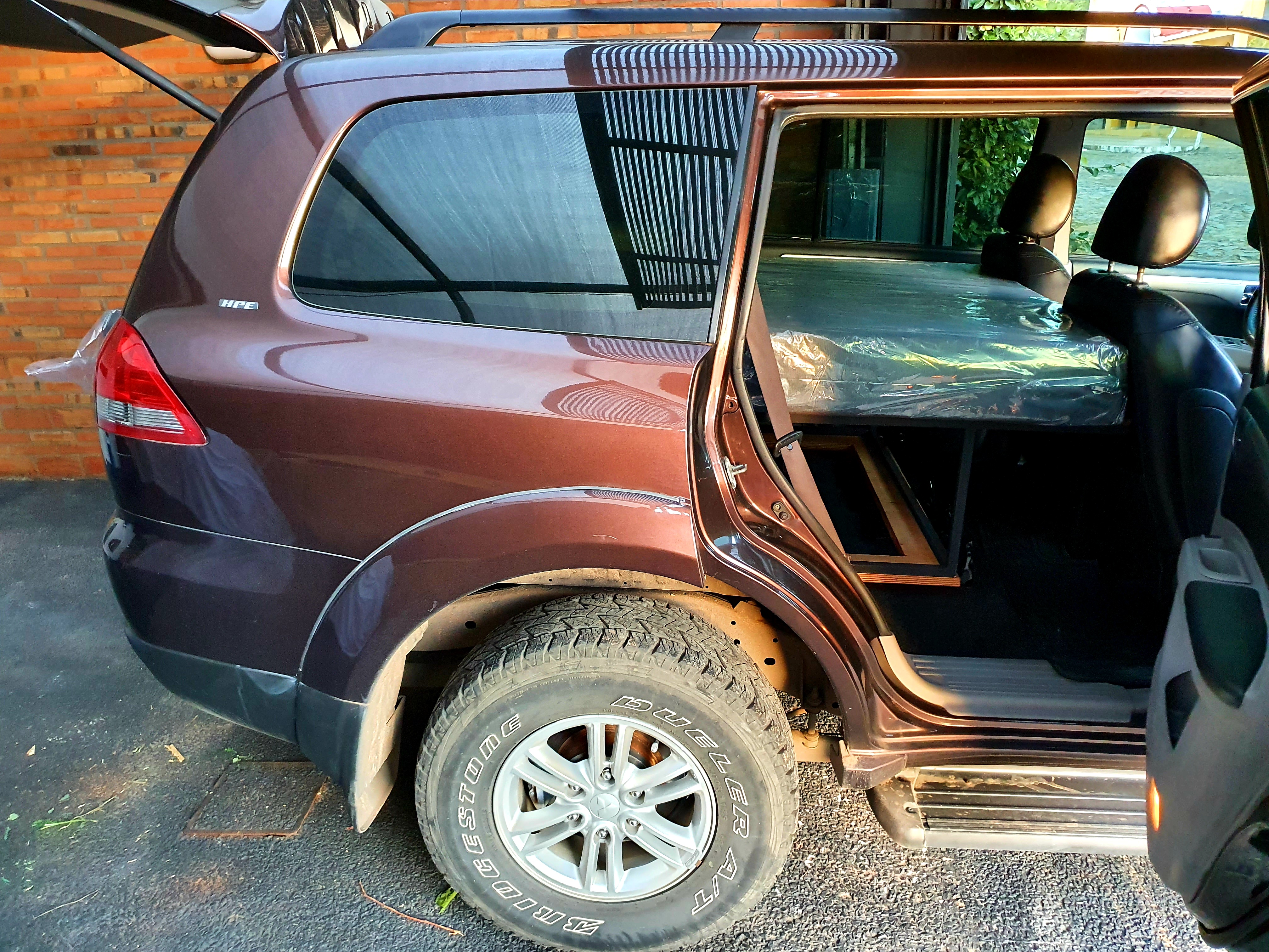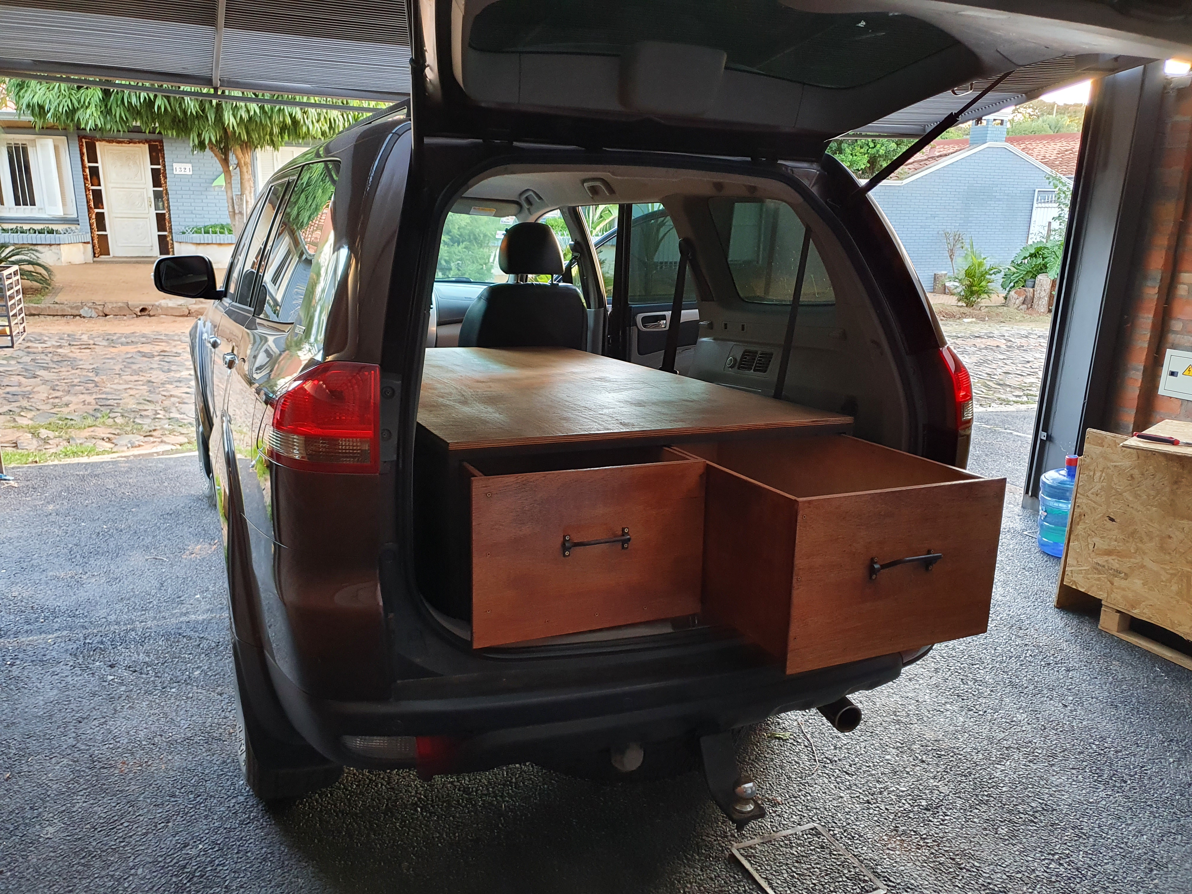 Wir verwenden seit 2008 eine relativ einfach gestalteten Einbau aus Holz im Auto. Im unteren Bereich haben wir unser Material in Euroboxen. Darüber schlafen wir auf Matratzen im Auto. Bei Regen spannen wir eine Plane, da sich das Leben natürlich durch den Einbau im Freien abspielt.