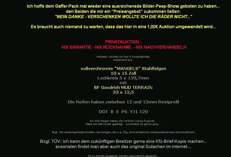 Aus der Reifen - Auktion - man beachte die letzte - kleingeschriebene Zeile: 'allzu dreiste Angebote werden automatisch abgelehnt...'