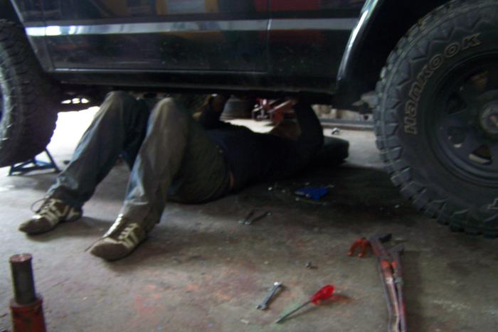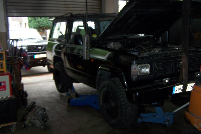 Thorsten war mit meinem revidierten Getriebe auch pünktlich da und es konnte gleich losgehen, bis wir kurze Zeit später feststellten dass und wichtige Teile fehlen, wie z.B. Ausrückhebel und Getriebeschrauben *lach, was für eine Panne, da ich die Getriebetraverse auch Zuhause stehen lassen habe sind kurz zu mir zurück um danach zu suchen. Bis auf die Traverse leider ohne Erfolg. Wenigstens konnte ich mal wieder in einem Patrol mitfahren, 4,2 l Turbodiesel ... wie GEIL sag ich nur!!!