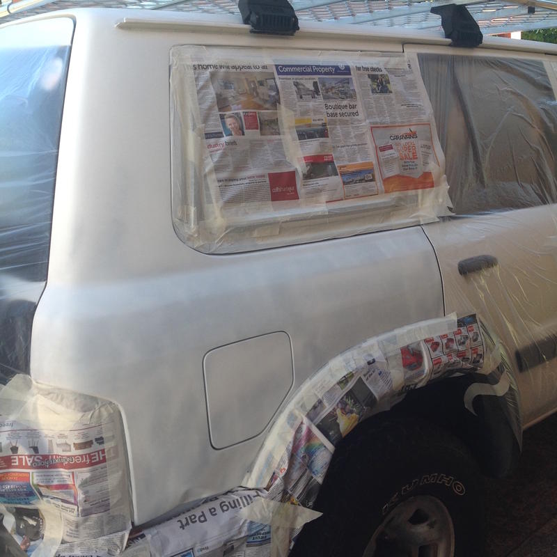 In Ermangelung einer Werkstatt oder wenigstens einer Garage fanden alle Aktionen im Freien statt. Die gegebenen Umstände machten das Spritzen aus Sprayflaschen zwischen Windböen zu einem Abenteuer ...