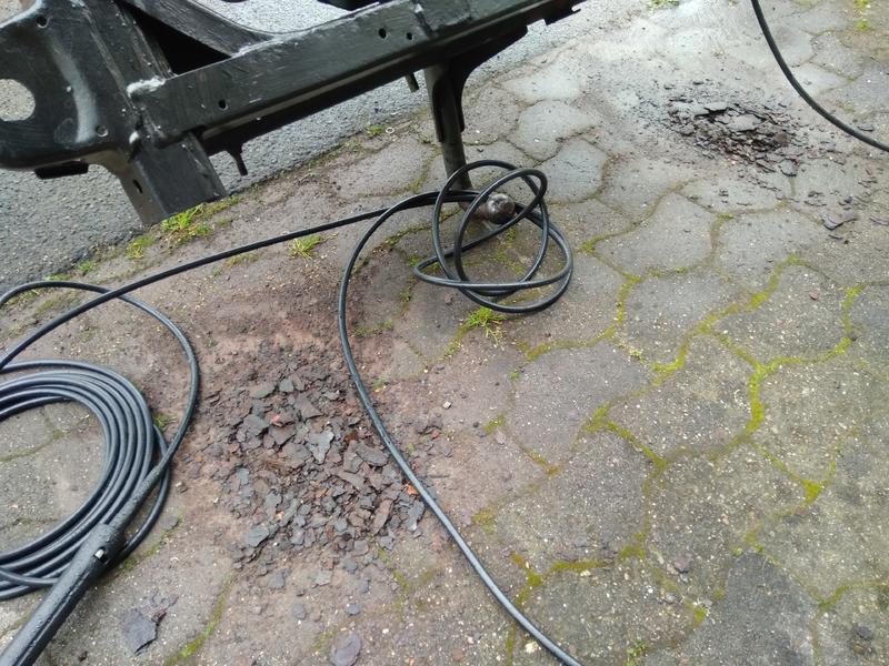 Vor der Konservierung habe ich den Rahmen nochmal ordentlich Durchgespült! Beim ersten spülen in der Waagerechten kam nur wenig raus, erst das Aufhängen am Stapler hat zum gewünschten Ergebnis geführt.