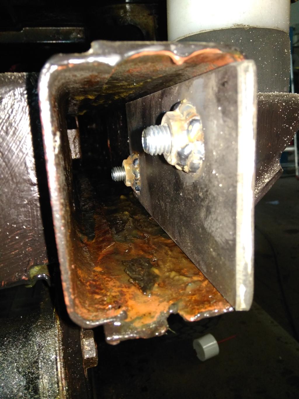 Als erste habe ich ein Flacheisen mit Muttern verschweisst um die Stoßstange mit dem Rahmen zu verbinden