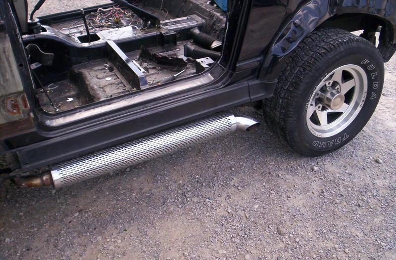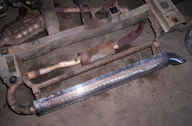 Eine delta 4x4 Sidepipe. Wird an den Flansch hinterm Kat statt des hinteren Topfes angeschlossen. Die Sidepipe selbst ist noch recht gut beieinander, die Verrohrung davor wurde offenbar schon ein paar Mal ziemlich bemurkst. Vor Einbau sollte auf jeden Fall ein neuer Rohrbogen eingeschweißt werden. Gibt aber einen fetten Sound.
