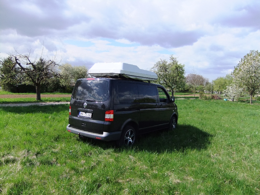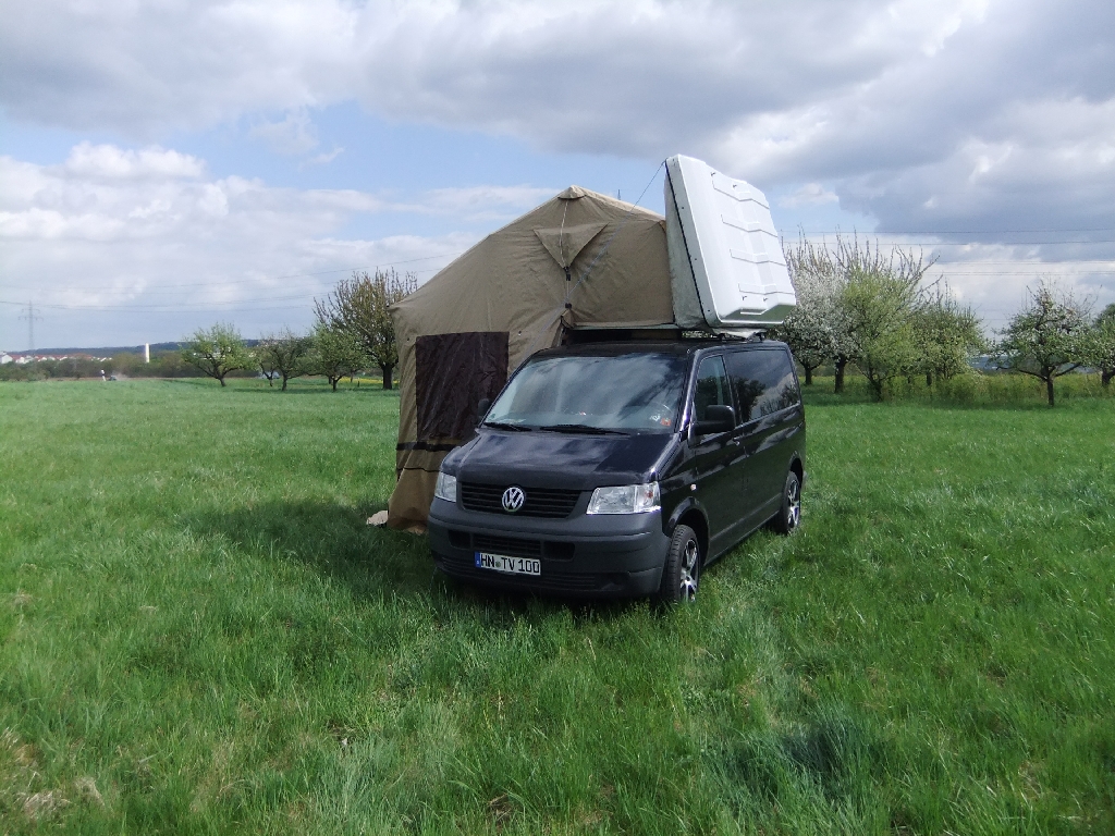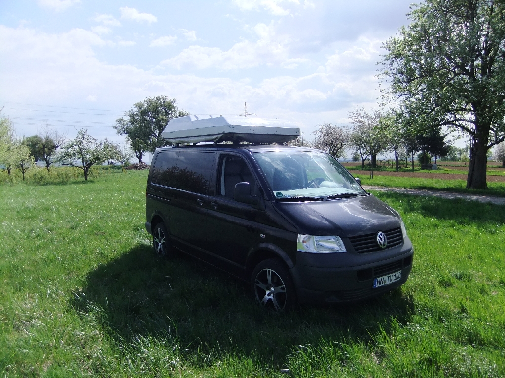 Dachträger für den T5 oder einen LandRover Defender sind dabei. Befestigung beim T5 in der C-Schiene.