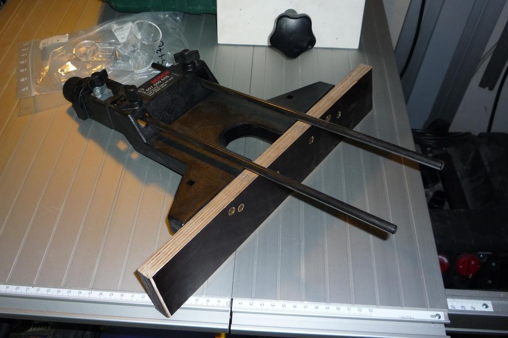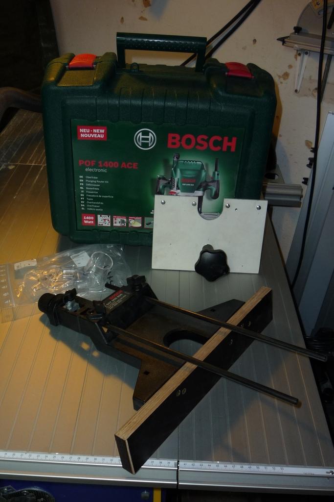 Zu der Oberfräse gehört natürlich alles Zubehör, teilweise noch nie ausgepackt, der Koffer , BDA, ein vernünftiger 19er Schlüssel, eine zweiter Absaugadapter inkl. Schrauben und der Bosch Parallelanschlag mit Feinjustierung der GOF Modelle und ein selbstgebauter Winkelanschlag, der an dem Parallelanschlag geschraubt werden kann, um die Fräse z.B. auf Brettkanten besser führen zu können.