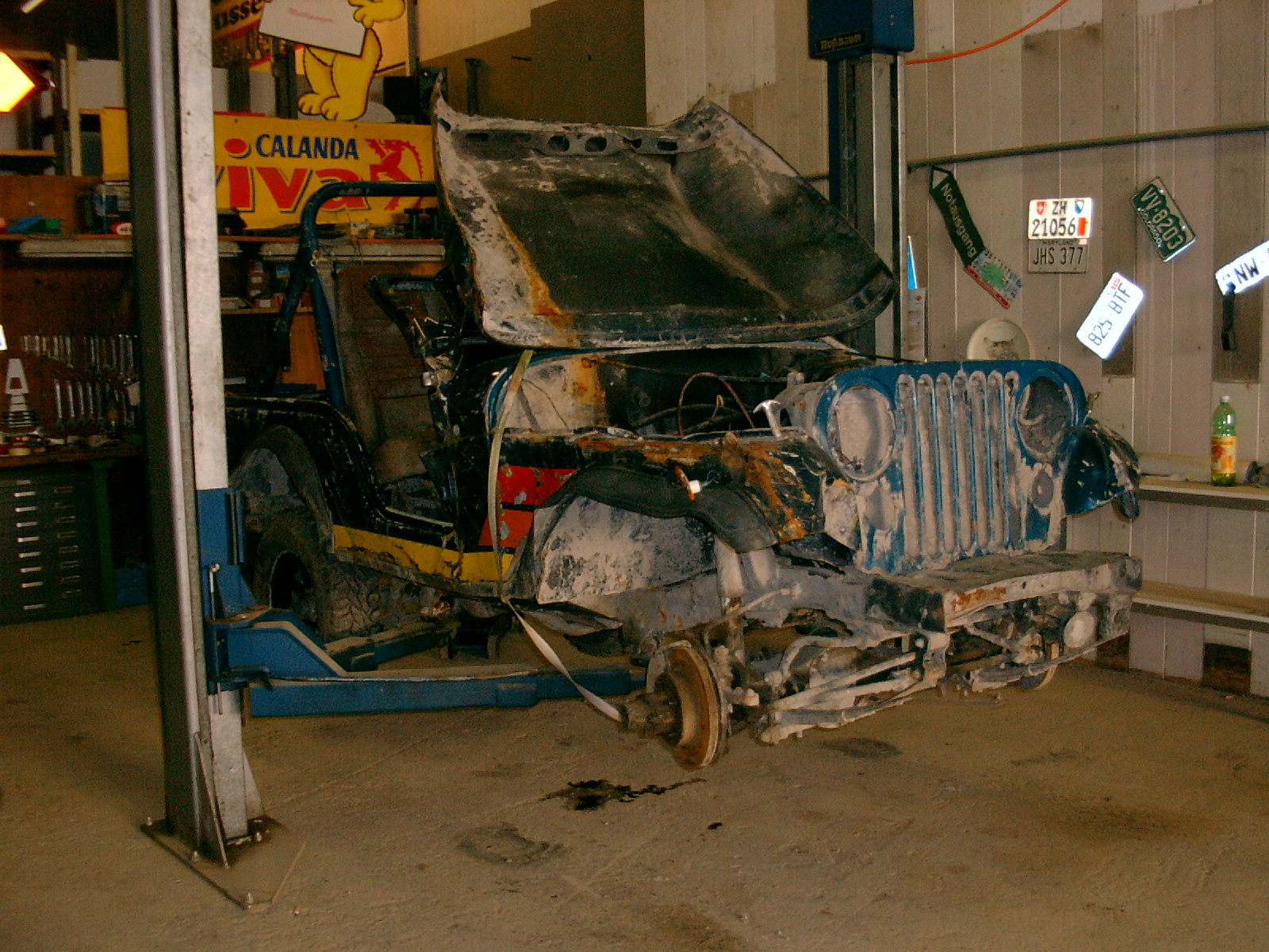 Am Saisonendlauf in Ederswiler (CH) segnete mein geliebter CJ5 durch einen Front- und 1 3/4 Seitenüberschläge definitiv das Zeitliche. (Mein Beifahrer und ich blieben dabei dank Käfig, Schalenstühlen, Hosenträgergurten und Helmen völlig unversehrt)