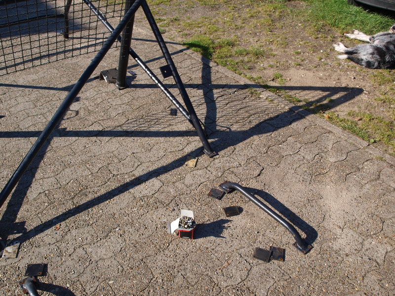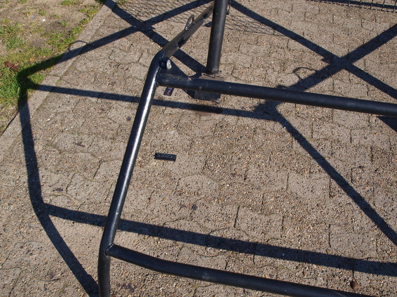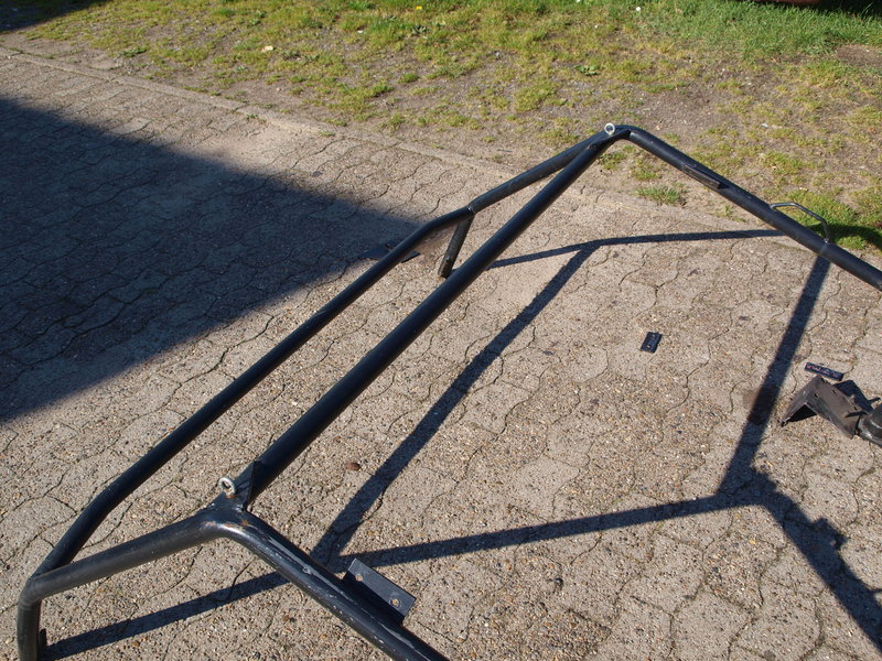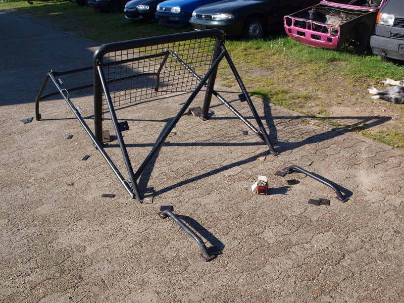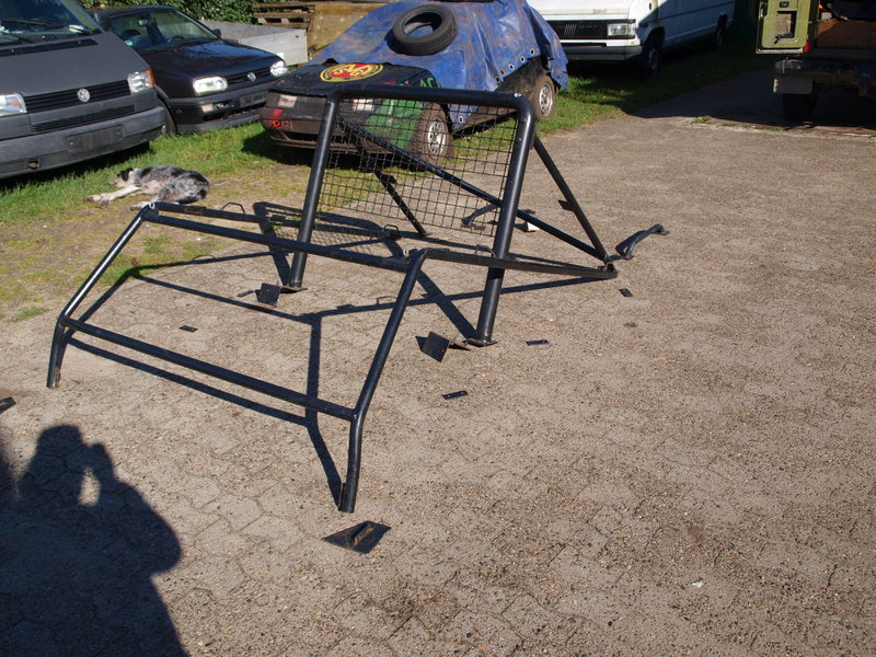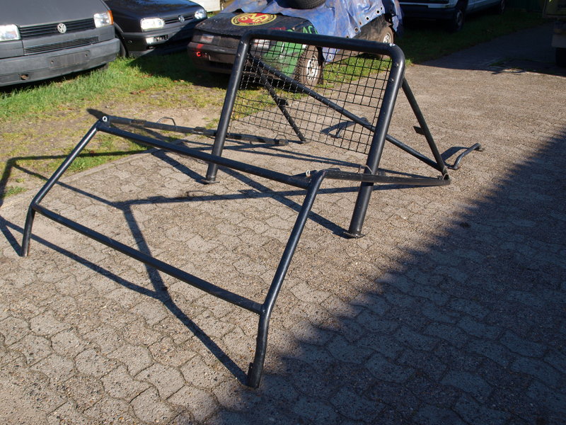 Der Hauptbügel ist ohne Verstrebung, die einzelne Diagonale an der Heckabstützung hält nicht wirklich was, zudem ist alles verschraubt (nicht nach FIA-Vorgaben, sondern mit Flacheisen etc.) und der vordere Teil des Bügels scheint eher ein Astabweiser zu sein, wird wohl auf die Karosserie geschraubt. Die Rohre mit Ausnahme des Hauptbügels scheinen mir auch etwas unterdimensioniert zu sein.