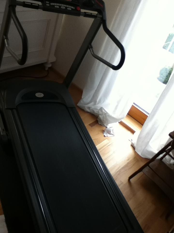 . . . großzügige Lauffläche (150 x 49 cm). - Die Geschwindigkeit ist in 0,1 km Schritten von 0,8 bis 16 km/h fein abstufbar und kann auch über zehn Geschwindigkeitsdirektwahltasten eingestellt werden. - Die Neigung von 0 - 10 % kann elektronisch gewählt werden. - 10 Trainingsprogramme (davon 2 Benutzer- und ein pulsgesteuertes Programm). - Die Trainingszeit ist bis zu 99 Minuten frei wählbar. Handpulssensoren zur Ermittlung der Herzfrequenz. - Das Laufband ist ohne großen Kraftaufwand klappbar. - Stellfläche: L x B x H: 198 x 84 x 130 cm Klappmaß: 81 x 84 x 188 . Wenig gebraucht.